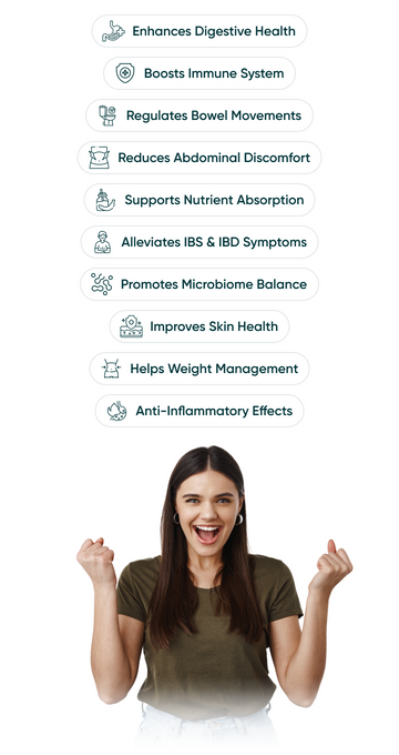It enhances digestive health with kiwifruit fibers, supporting beneficial bacteria, bowel regularity, and immune strength. Ideal for IBS and digestive discomfort.
